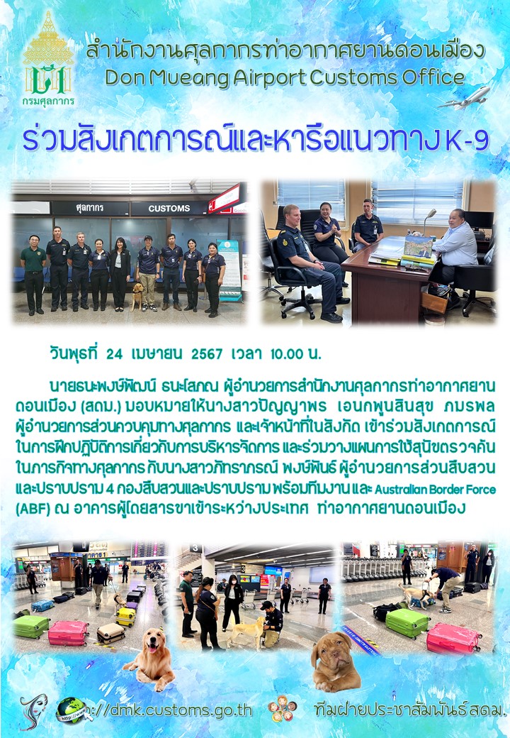 นายธนะพงษ์พัฒน์ ธนะโสภณ ผอ.สดม. มอบหมายให้ นางสาวปัญญาพร เอนกพูนสินสุข ภมรพล ผอ.สคศ. และเจ้าหน้าที่ในสังกัด เข้าร่วมสังเกตการณ์ในการฝึกปฏิบัติการเกี่ยวกับการบริหารจัดการและร่วมวางแผนการใช้สุนัขตรวจค้นในภารกิจทางศุลกากร