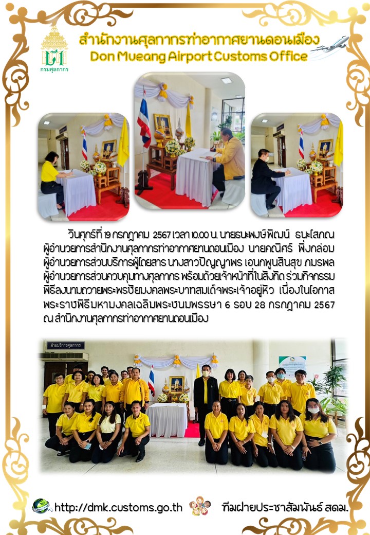 วันศุกร์ที่ 19 กรกฎาคม 2567 เวลา 10.00 น. นายธนะพงษ์พัฒน์ ธนะโสภณ ผู้อำนวยการสำนักงานศุลกากรท่าอากาศยานดอนเมือง พร้อมด้วยเจ้าหน้าที่ในสังกัด ร่วมกิจกรรมพิธีลงนามถวายพระพรชัยมงคลพระบาทสมเด็จพระเจ้าอยู่หัว เนื่องในโอกาส พระราชพิธีมหามงคลเฉลิมพระชนมพรรษ