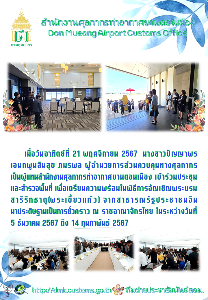 วันอาทิตย์ที่ 21 พฤศจิกายน 2567 นางสาวปัญญาพร เอนกพูนสินสุข ภมรพล ผู้อำนวยการส่วนควบคุมทางศุลกากร เป็นผู้แทนสำนักงานศุลกากรท่าอากาศยานดอนเมือง เข้าร่วมประชุมและสำรวจพื้นที่ เพื่อเตรียมความพร้อมในพิธีการอัญเชิญพระบรมสารีริกธาตุ (พระเขี้ยวแก้ว)