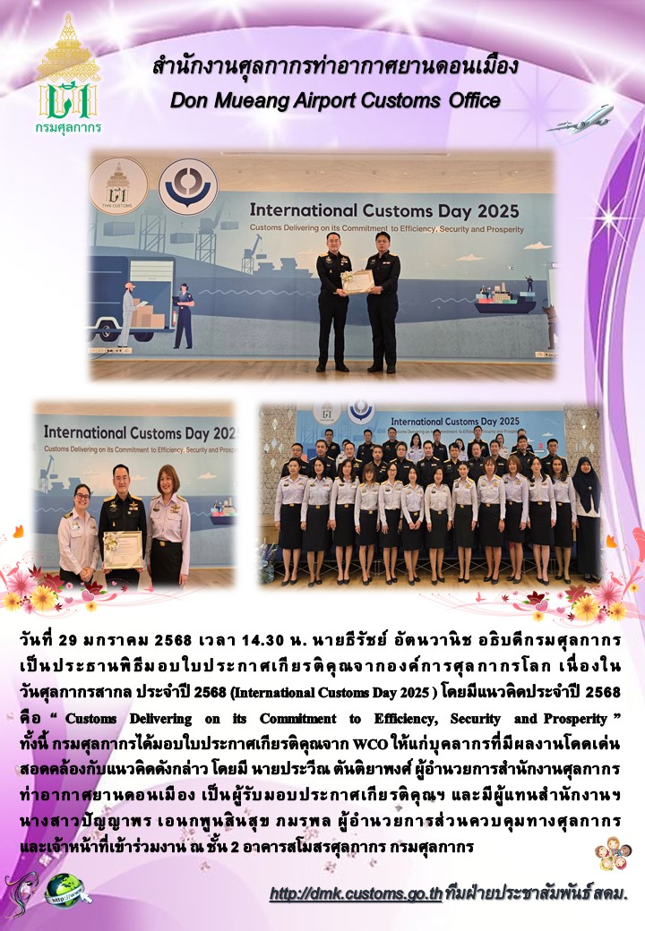 วันที่ 29 ธันวาคม 2567 เวลา 14.30 น. นายประวีณ ตันติยาพงศ์ ผู้อำนวยการสำนักงานศุลกากรท่าอากาศยานดอนเมือง ได้รับมอบประกาศเกียรติคุณจากองค์การศุลกากรโลก เนื่องในวันศุลกากรสากล ประจำปี 2568 ณ อาคารสโมสรศุลกากร ชั้น 2 กรมศุลกากร