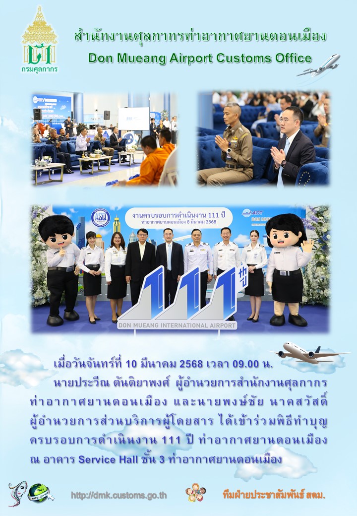 วันจันทร์ที่ 10 มีนาคม 2568 เวลา 09.00 น. นายประวีณ ตันติยาพงศ์ ผู้อำนวยการสำนักงานศุลกากรท่าอากาศยานดอนเมือง และนายพงษ์ชัย นาคสวัสดิ์ ผู้อำนวยการส่วนบริการผู้โดยสาร ได้เข้าร่วมพิธีทำบุญครบรอบการดำเนินงาน 111 ปี ท่าอากาศยานดอนเมือง